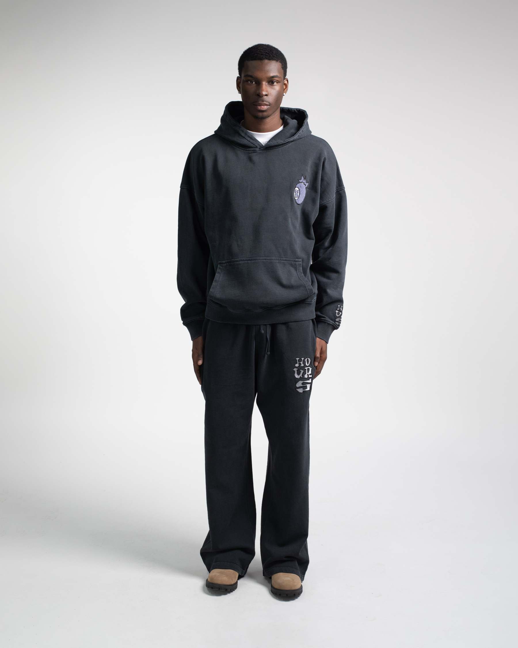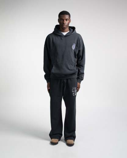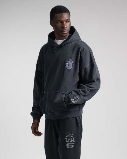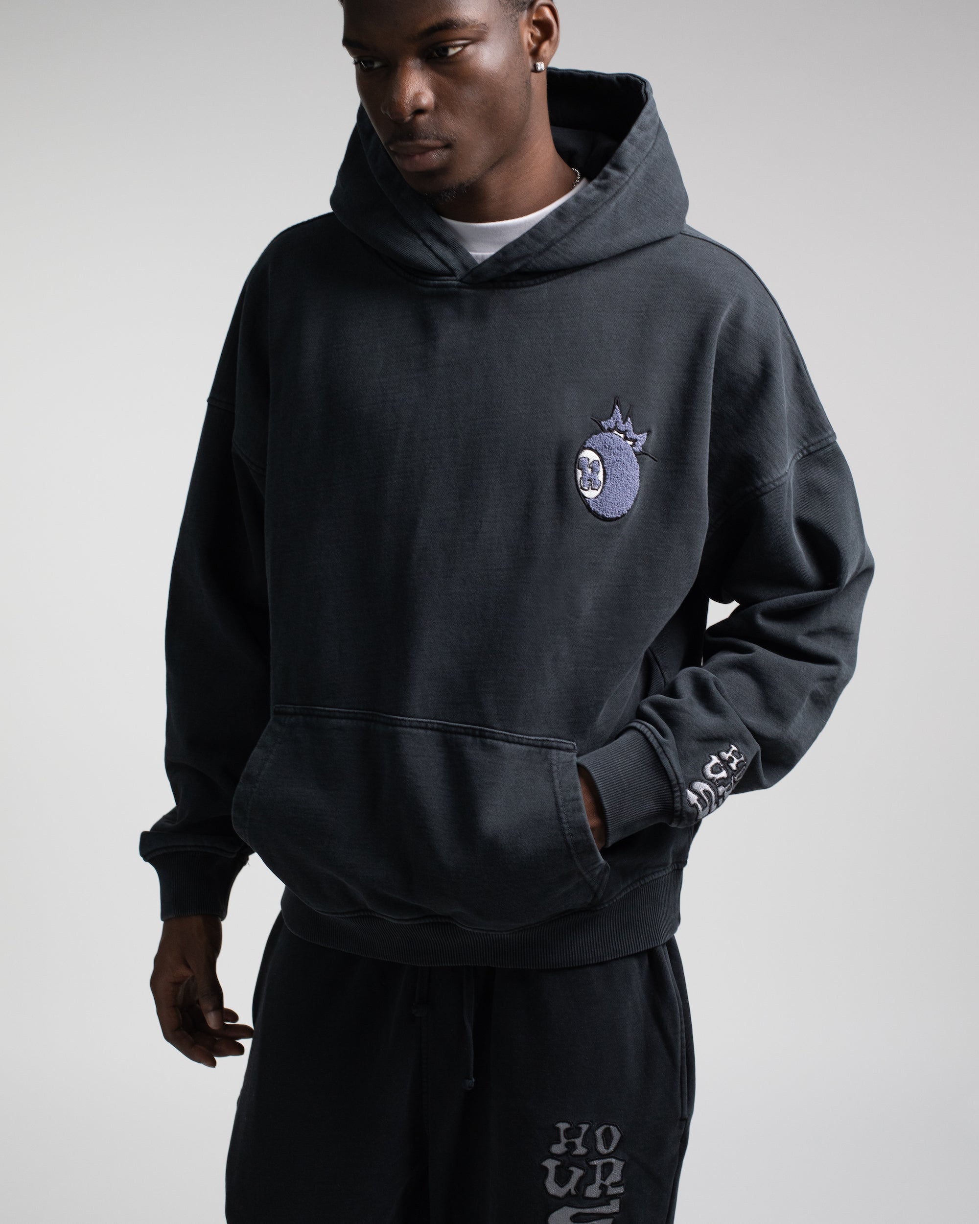 Crafted from a premium 450GSM 100% cotton french terry fabric, our iconic drop shoulder hoodie features a relaxed fit, cinched hem, and drop shoulders giving it a unique boxy look.  A specialized mineral stone wash has been used to obtain a vintage look, ensuring each piece is one-of-a-kind. The piece is completed with a chenille patch design.