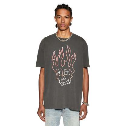 The Skull Biggie Short Sleeve Tee Faded Black is an oversized short sleeve t-shirt with a raw-cut back hem, reverse overlocked side seam, and signature rats tail, crafted from premium cotton jersey in faded black dye. It features front screen-printed seasonal artwork and is finished with signature t-box branding.