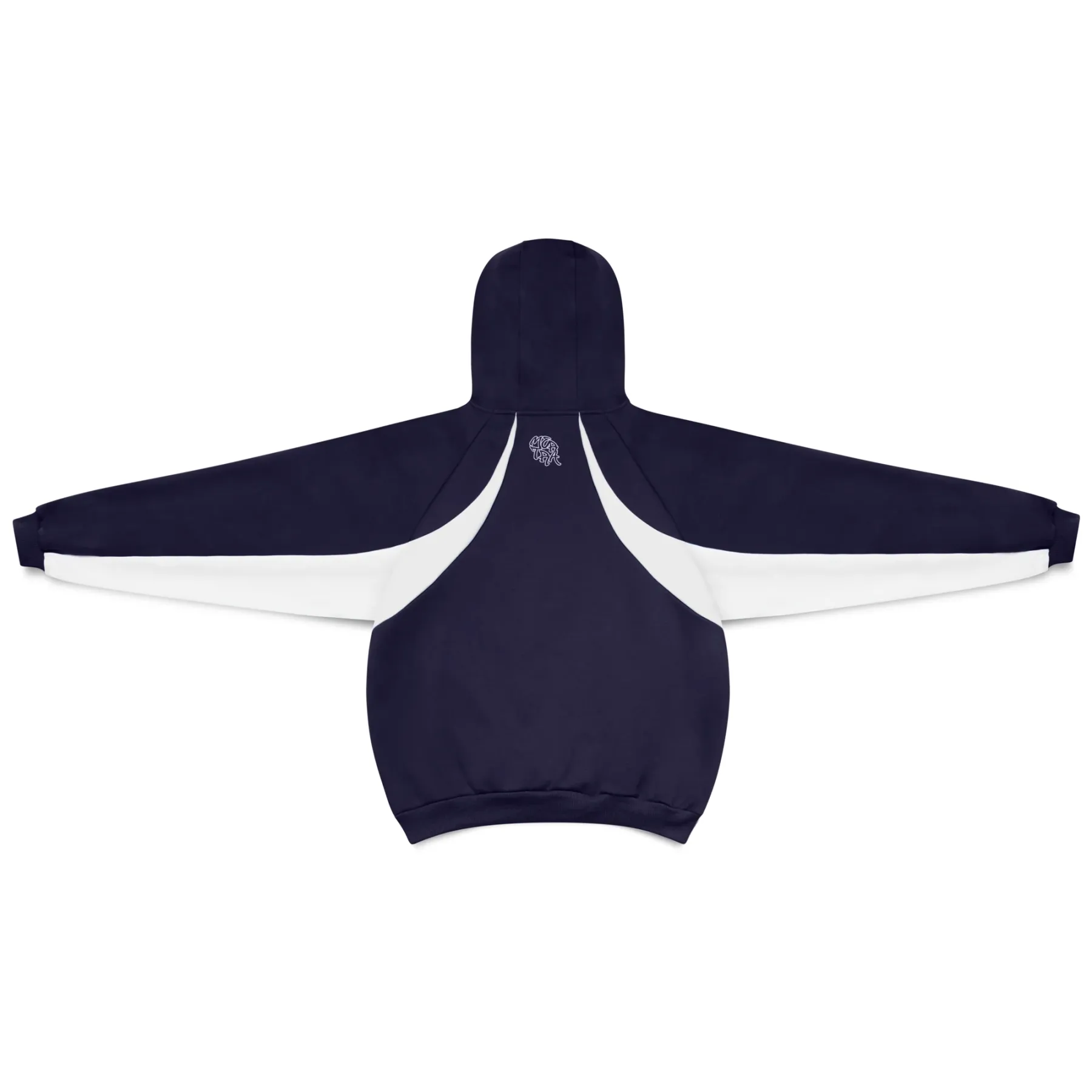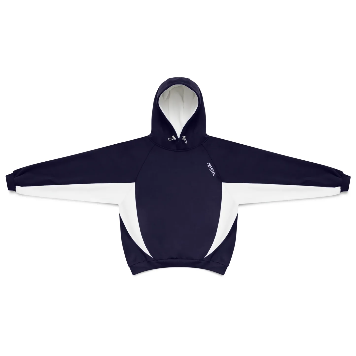 The Mertra (Navy/White) delivers a bold athletic look with its deep navy base and sharp white contrast panels. Made from soft mid-weight fleece, it offers warmth and comfort while keeping a structured, modern silhouette. The curved panel shaping enhances movement and gives the hoodie a premium, signature Mertra aesthetic. A high-neck hood adds extra protection and a sporty edge, making it ideal for cooler days. Perfect for those who want a clean, standout hoodie that blends performance, comfort, and contemporary streetwear style