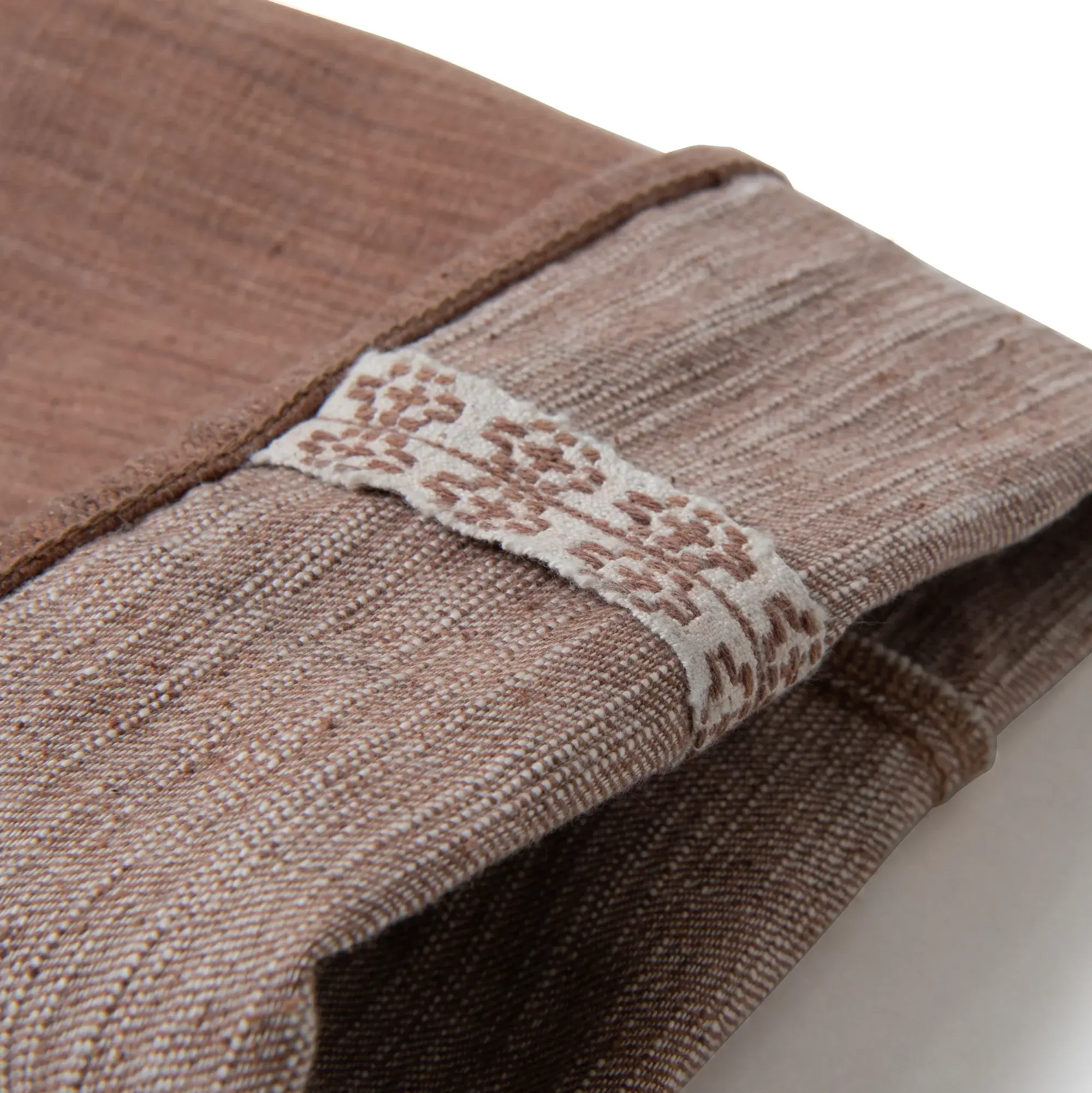 The new "Kaki-Kyoku" Denim epitomizes the pursuit of ultimate texture. Utilizing the traditional Japanese "Kasezome" dyeing method, the warp yarns are tediously dyed in naturally derived Kakishibu (Persimmon fruit) and feature a harmonious blend of No. 6 slub and nep yarn. Pushing the weaving capability of the looms to their limit, the resulting fabric features a pronounced and intensely irregular texture.