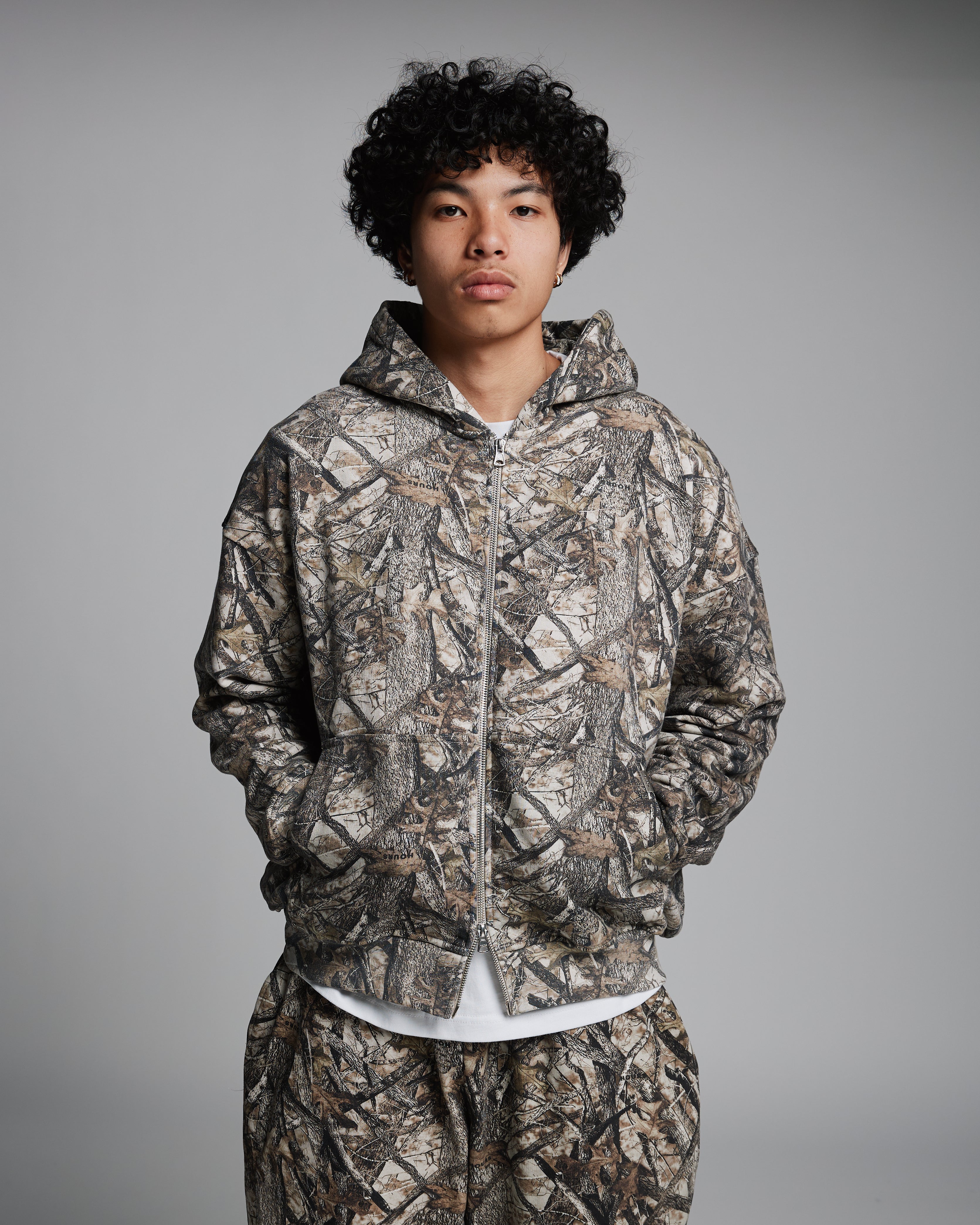 Introducing our custom Camouflage pattern printed on our Vintage Terry Zip Hoodie. Made from 450 GSM 100% cotton French terry, this piece features a relaxed fit, drop shoulders, and a double-zip closure. A mineral stone wash gives the camo pattern a worn-in finish, with natural variations that make each piece unique.