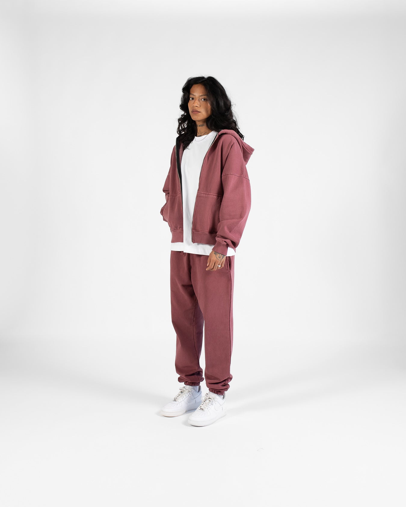 Crafted from a premium 450 GSM 100% cotton french terry fabric, this zip hoodie features a relaxed fit with drop shoulders and a double-zip closure. A specialized mineral stone wash has been used to obtain a vintage look, ensuring each piece is one-of-a-kind.