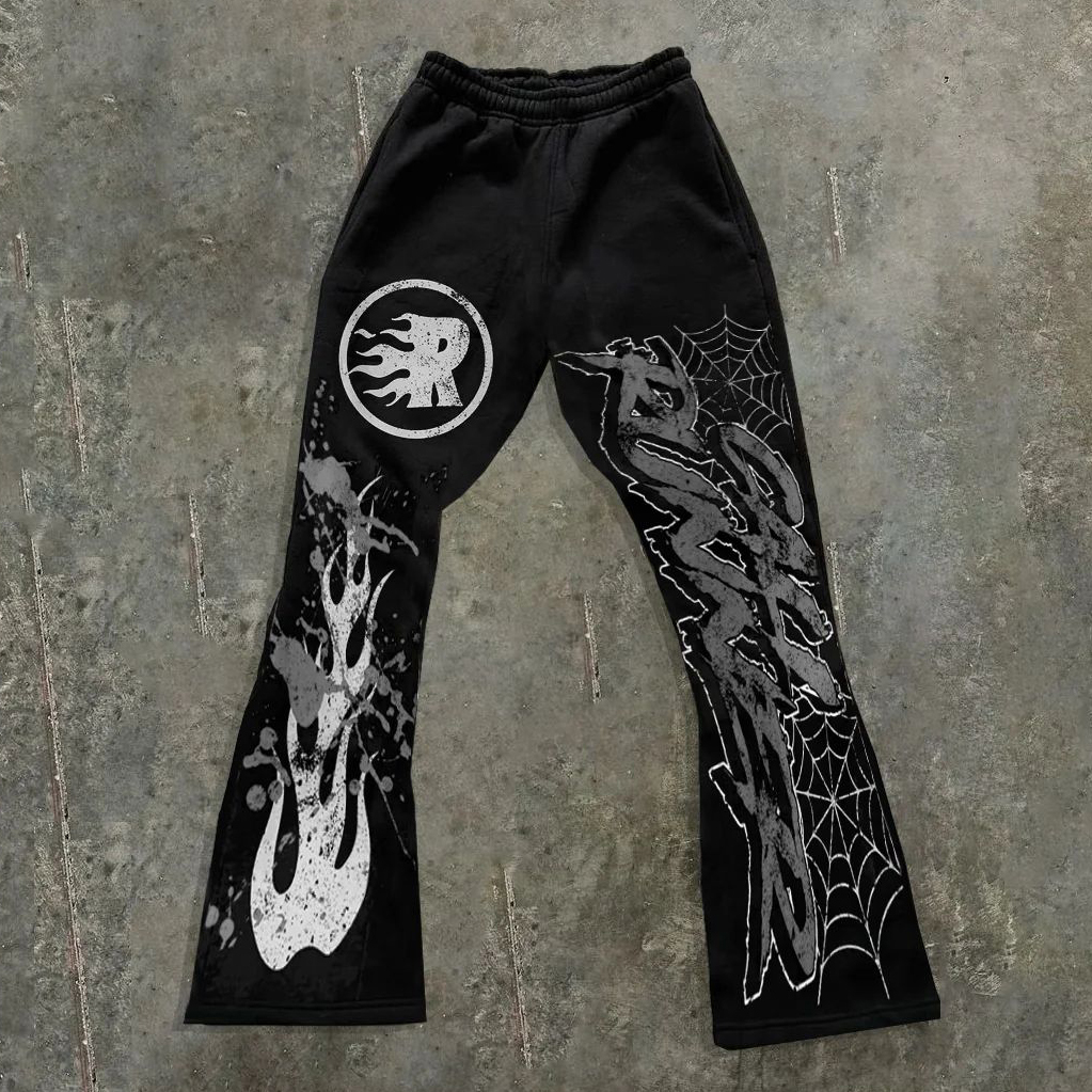 Flame Spider Web Print Pocket Flared Trousers