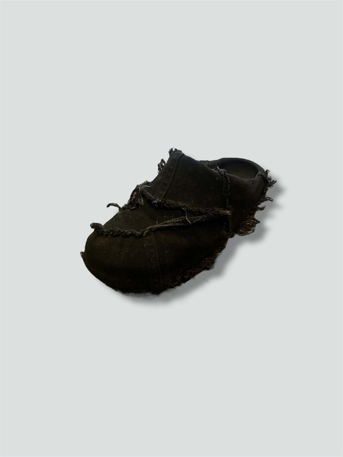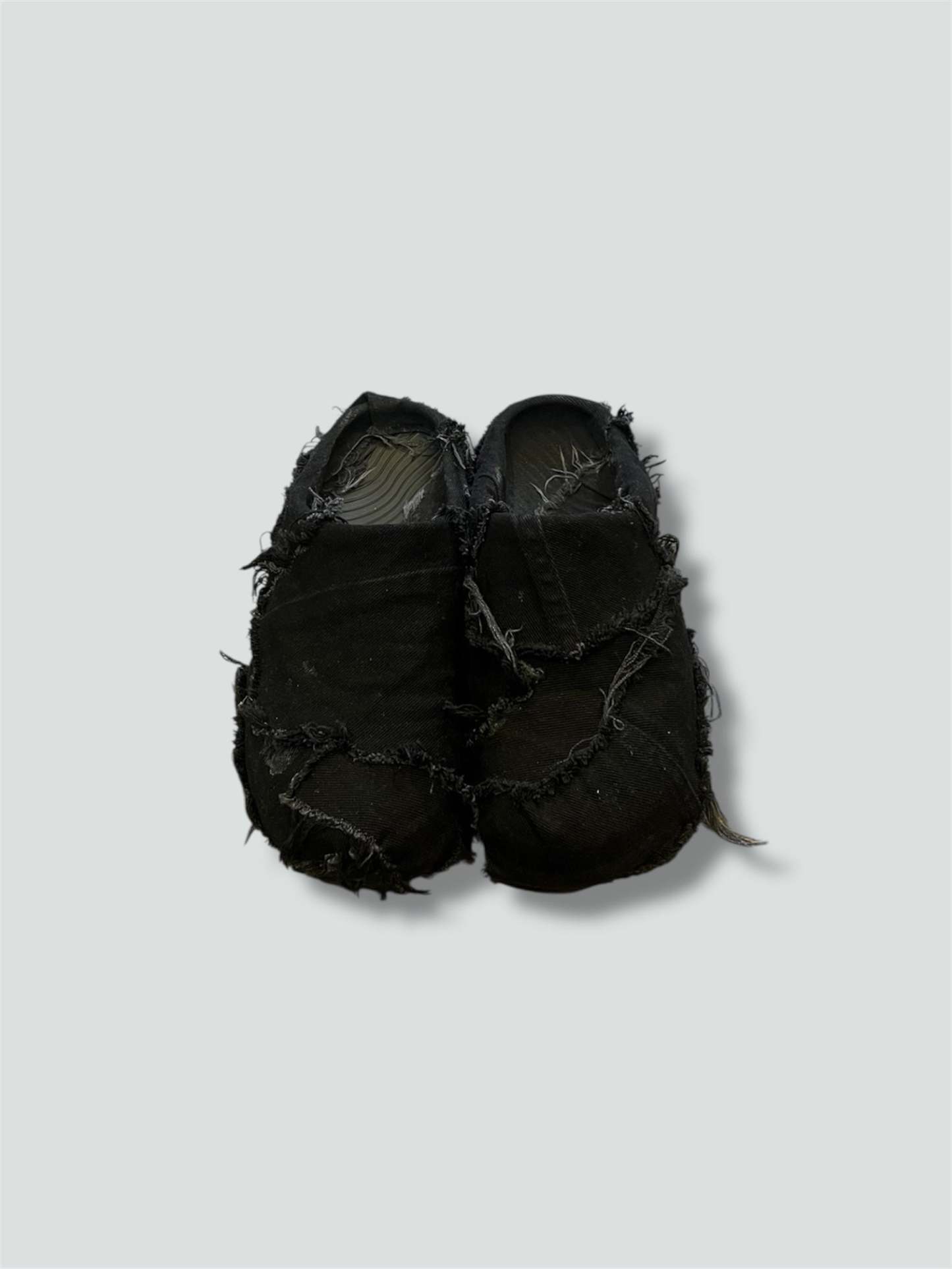 ITEM DESCRIPTION: Distressed black denim clogs. Fits true to size. Great for loungewear, baggy outfits and flared pants.