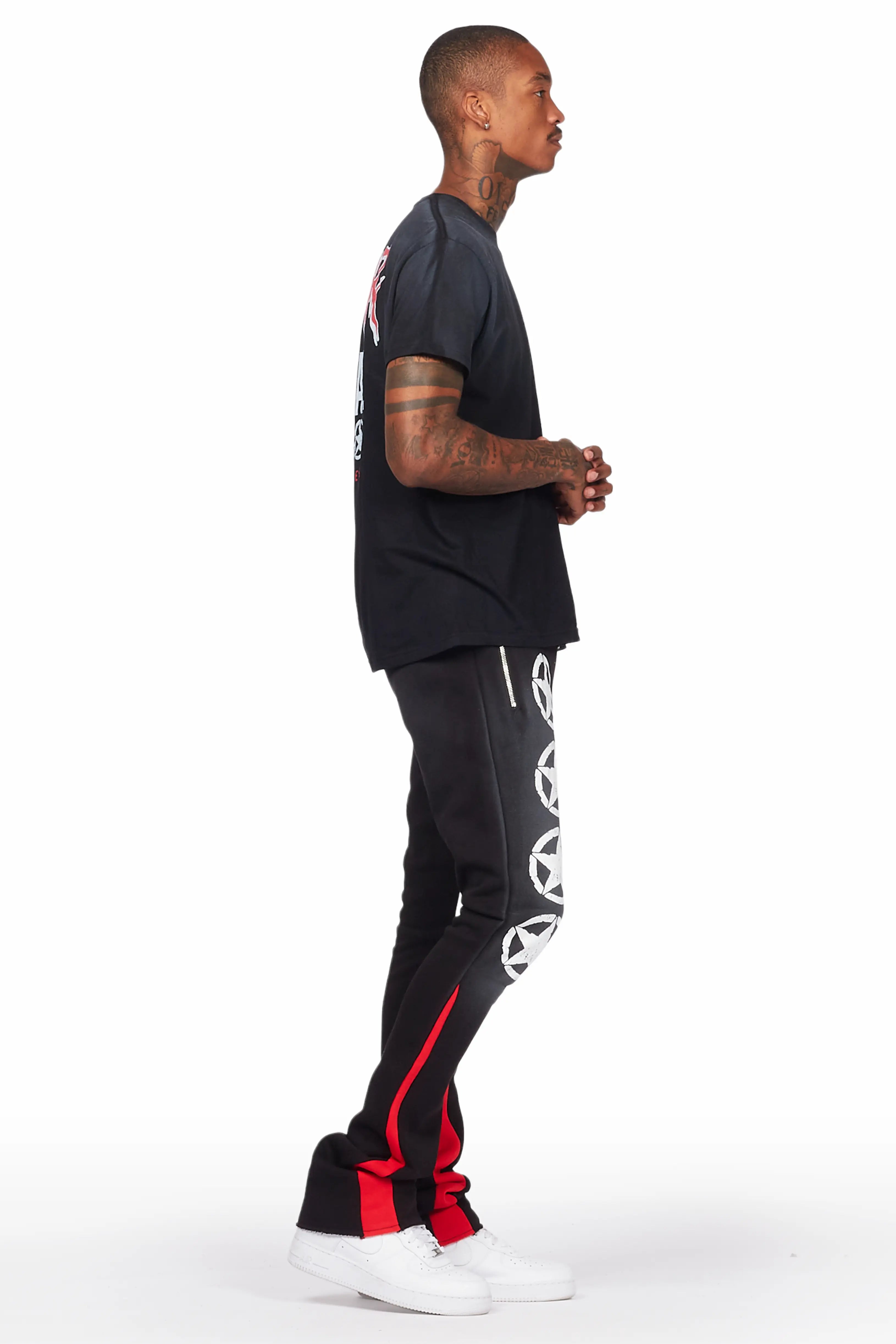 An urban two-piece t-shirt and stacked pant tracksuit set for men in black. Designed with ultra soft fabric and extra long legs for a dope streetwear set.
