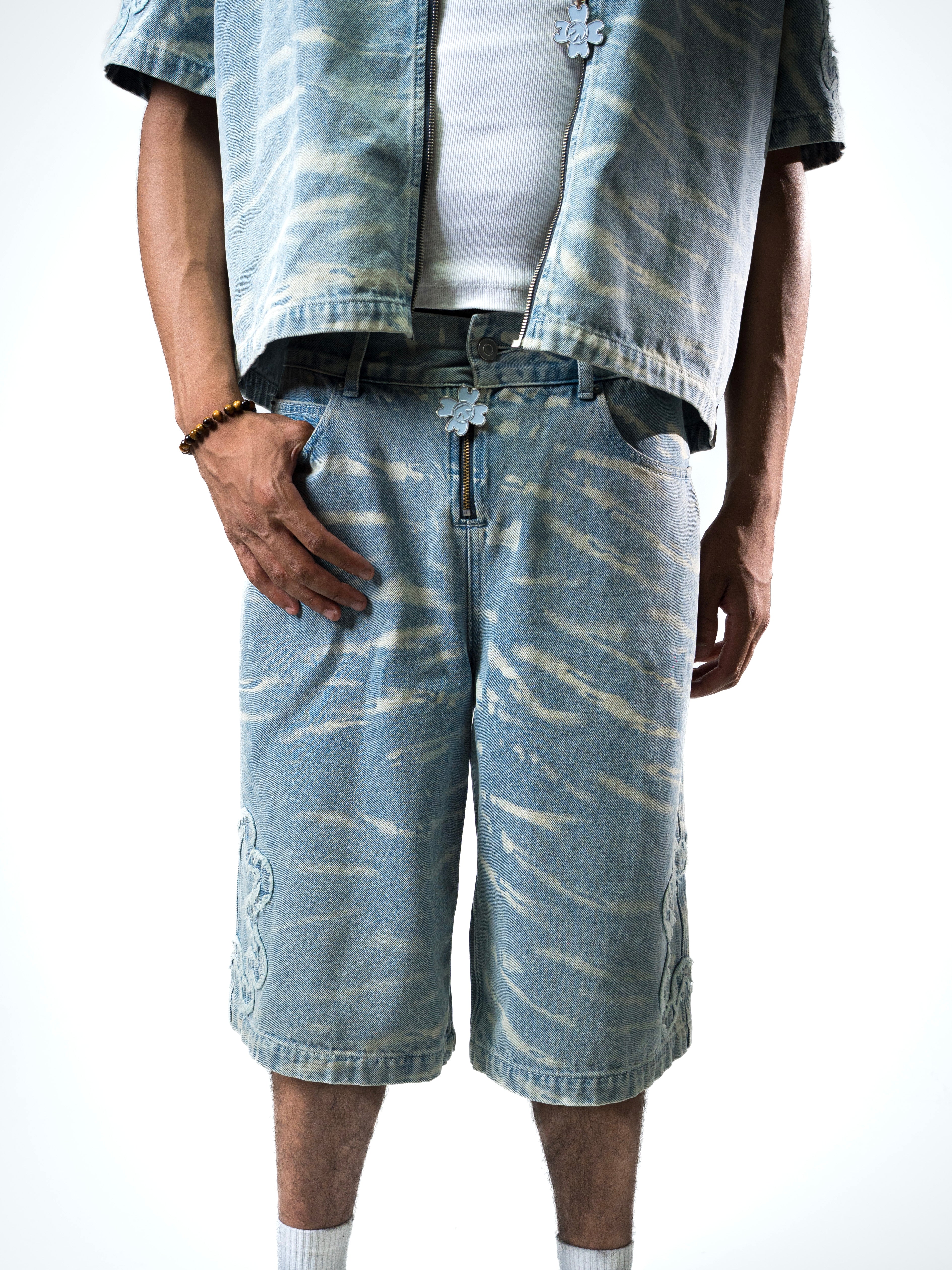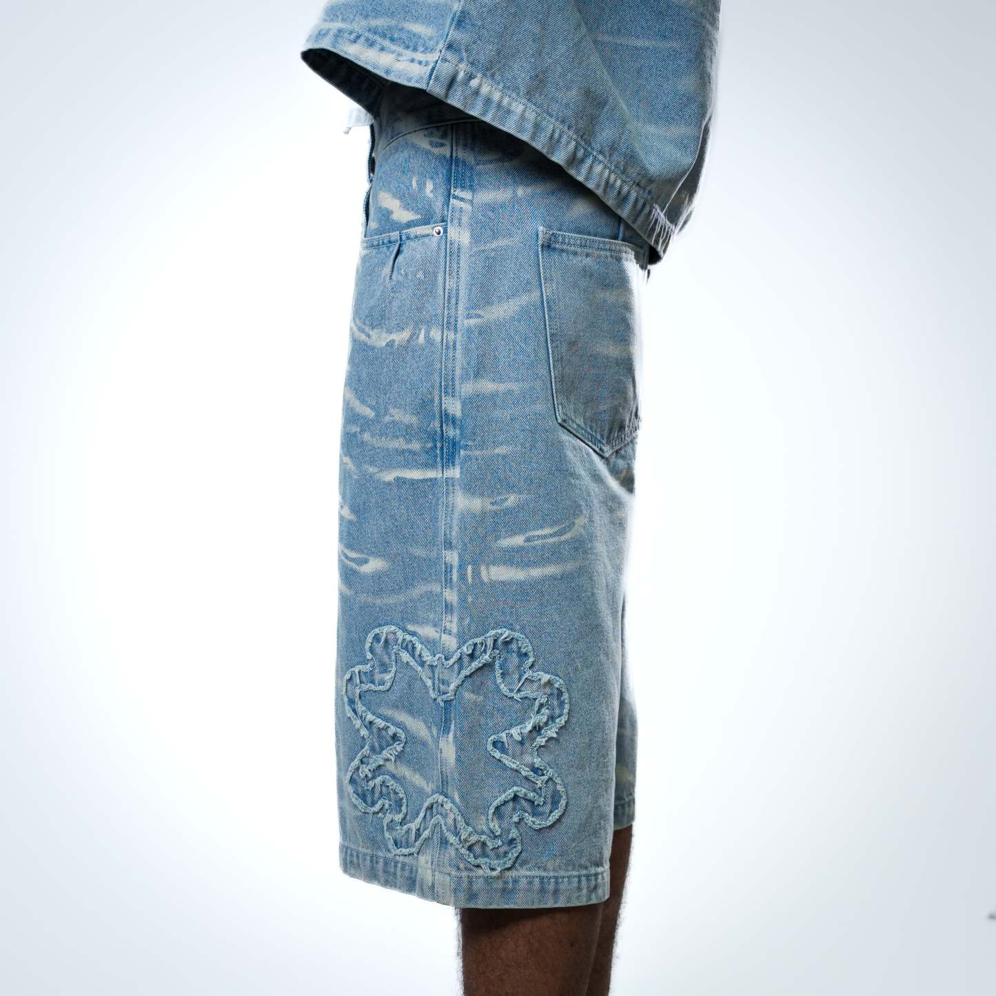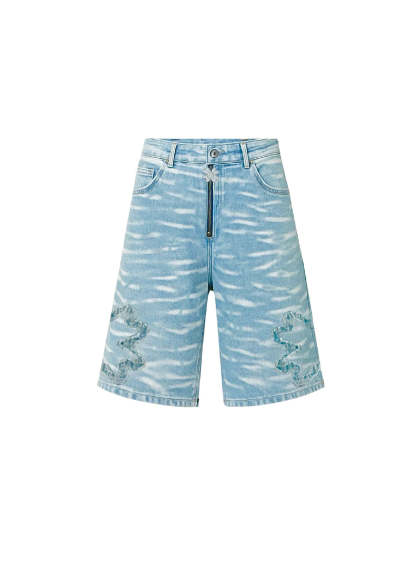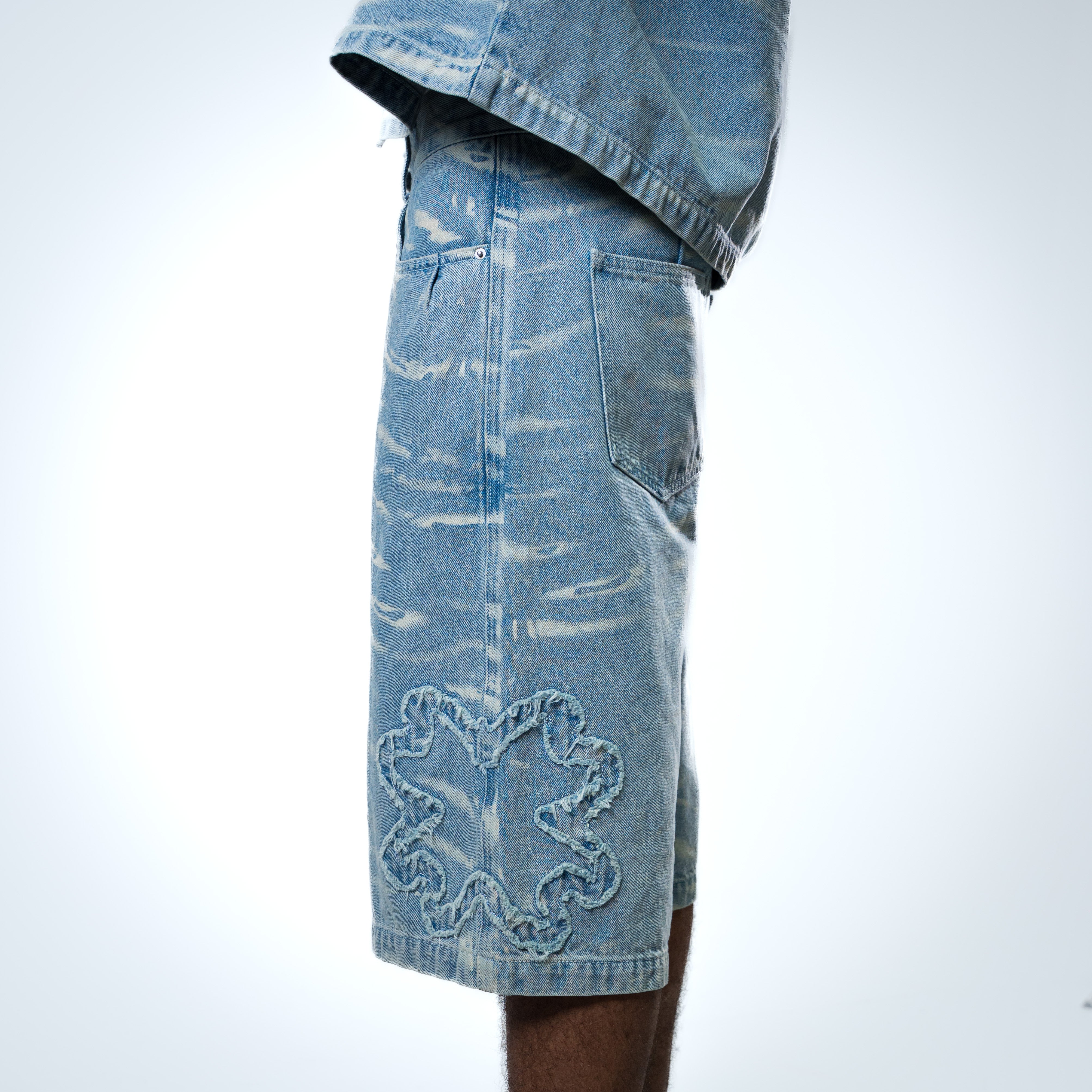 Une pièce forte, pensée pour briller sous le soleil ou en soirée. Les trèfles en jean, déchirés avec justesse, racontent un été qui se vit sans retenue.
