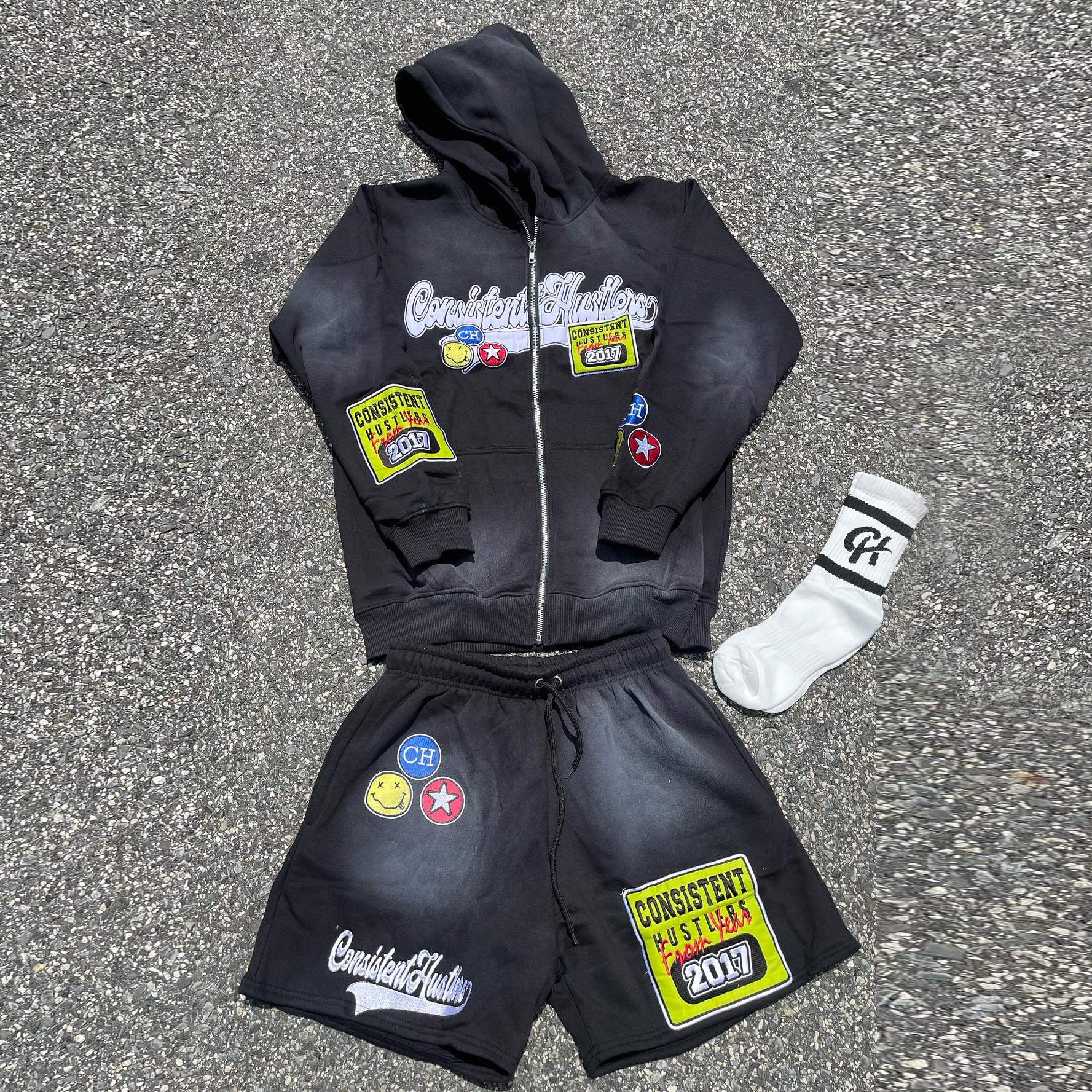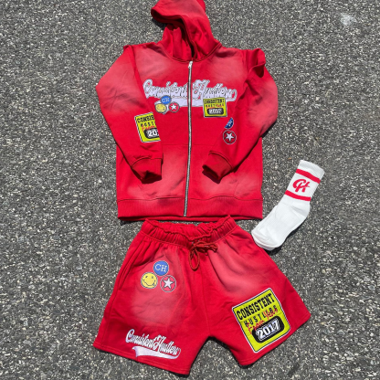 Street Style Smiley Shoulder Zipper Sweatshirt Set