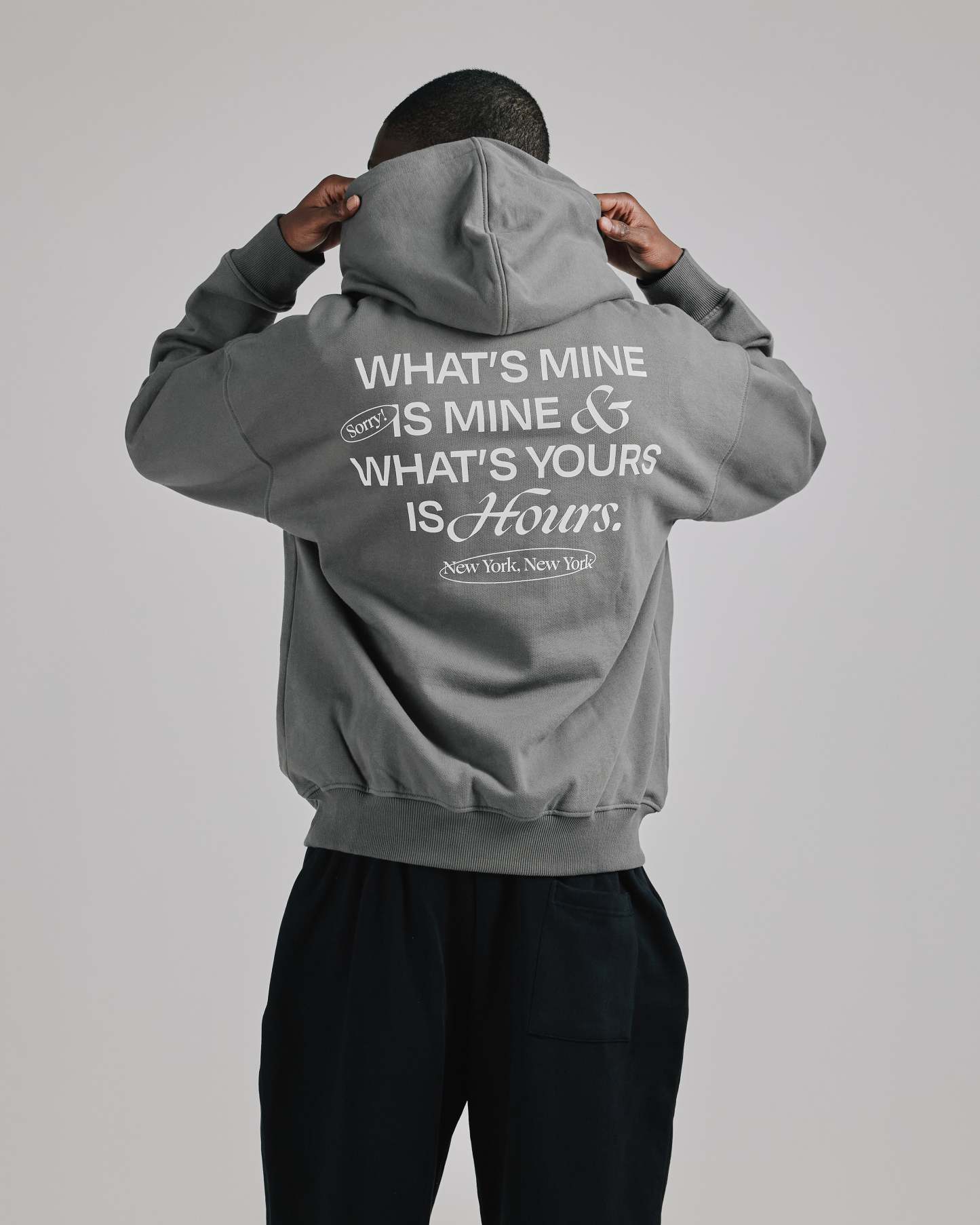 Made in the same silhouette as our popular drop shoulder hoodies, this garment is crafted from 100% 400GSM Cotton fabric and features our 'Yours is Hours' design.